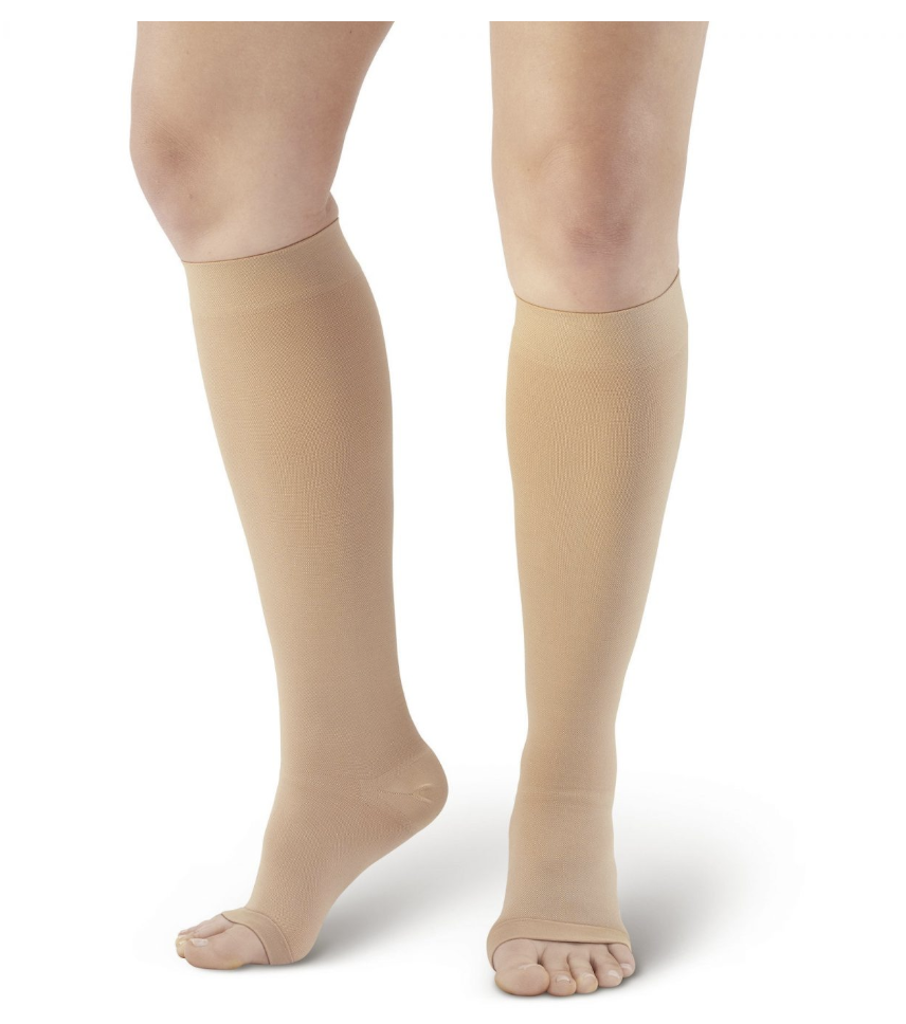 Below knee, class 2 graduated compression sock with open toe and reinforced heel.
